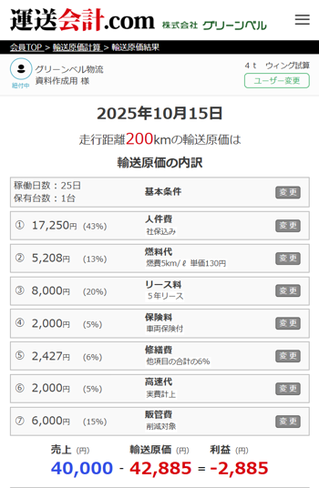 走行距離200kmで1日あたり40,000円の運賃業務を想定した場合、その原価を可視化すると運賃の約7%が赤字という結果になりました。
